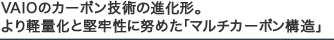 | VAIOのモバイルPCでは、優れた強度と軽量化を両立させるカーボン素材の採用に、あくなきチャレンジを続けてきました。type Gでは、そこで培った技術とノウハウを結集し、新たなテーマに挑戦。それは、カーボン素材をボディの一部に使うのではなく、天面、底面、パームレスト面といった、ボディのほぼ全面に使用すること。フラットな形状の天面はもちろん、内蔵の部品やドライブ、端子類などで複雑な形状となる底面やパームレスト面でも、マルチレイヤーカーボンファイバーとカーボンモールド(カーボンファイバー強化プラスチック)を使い分けることで、高精度な成形を実現。さらに進化したカーボン技術の粋を集め、軽さと強さという相反するファクターを高次元で両立させた「マルチカーボン構造」が誕生したのです。 | ![]() |