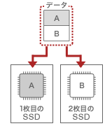 2枚のSSD(Solid State Drive)にデータを均等に振り分けて記録する方式で、「ストライピング」とも呼ばれます。分散されたデータに同時並行でアクセスできるため、書き込みや読み出しがより高速になります。