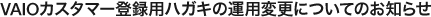 VAIOカスタマー登録は、インターネット経由でのご登録のほか、製品に同梱のハガキでの登録も一部の機種で受け付けておりましたが、このハガキ登録を2006年8月30日をもちまして終了させていただき、インターネットを通じてのご登録のみとさせていただきます。ハガキ登録対象製品をご所有で、カスタマー登録をまだお済ませでないお客様は、受付終了日までにご登録いただきますようお願いいたします。