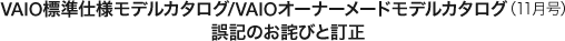 日頃より、ソニー製品をご愛用いただき誠にありがとうございます。 この度、弊社『VAIO標準仕様モデルカタログ/VAIOオーナーメードモデルカタログ(11月号)』および『VAIO標準仕様モデルカタログ(11月号)』の「type U」のページにおきまして、下記の誤記があることが判明いたしました。 お詫びを申し上げますとともに、以下のとおり訂正させていただきます。 |