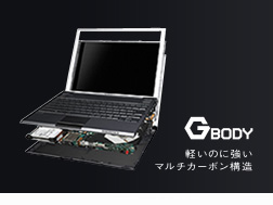 軽くて強い素材「カーボン」を天面、パームレスト面、底面に使うマルチカーボン構造を採用。バイオが長年培ってきたカーボン加工技術を生かし、軽量で堅牢なボディを実現しました。ハードディスクなどの心臓部はカーボンの頑丈な板に囲まれるかたちとなります。いわば頑丈な天井と床で作られた部屋。この頑丈な部屋の強度をさらに高めるため、“柱”にあたるネジを多く使い天井と床とをがっちり固定しました。建物で言えばすぐれた耐震構造です。