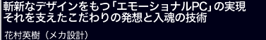 新 type Tのキーボードは、単に美しさを追求しただけのものではない。斬新なデザインをもちながら、毎日酷使される入力装置というキーボード本来の目的に十二分に応えるために、打ちやすさと同時に高い堅牢性をかね備えているのが特長だ。このキーボードを実現するために重要な役割をはたしたのが、メカ設計を担当したエンジニアの花村英樹である。デザイナーの井関が要求するデザインを裏側で支え、実現させた技術について花村はこう語る。 花村:新 type Tのキーボードでは、従来のVAIOノートのキーボードには見られなかった、新しい構造を採用しています。 キーボードパネルとキーボードを熱で溶着して一体化し、それをパームレストに取りつけています。キーボードには複数の小さな穴が空いていて、パームレストには小さなフックがあり、双方をスライドして入れこむことにより複数のツメで強固に密着する構造になっています。このように、薄い部品同士で支えあう構造にすることで打鍵時のキーの反りを抑え、厚みを増やさずにキーボードの剛性を向上させました。 |