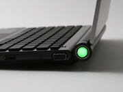 新 type Tのシリンダーデザインにアクセントを加えているのが、左右の端にある電源ボタンとDCコネクターである。これによって、電源・バッテリーに関連した部分が、1本の芯にスッキリと納められており、強いテーマ性を感じさせる形状に仕上がっている。特に、注目して欲しいのは電源ボタンだ。電源をオンにすると、宙に浮かぶ透明な光の芯が出現するという、幻想的な世界が出現する。デザイナーの井関のこだわりと、設計の花村の技術の融合から生まれた“逸品”だ。 花村:電源ボタンは、非常に時間と労力をかけて実現した部分のひとつです。通常のLEDだと、グリーンといっても実際には黄色っぽい薄いグリーンになってしまうのですが、デザイナーの井関は、「違和感があるので、どうしてもエメラルドグリーンにしたい」と(笑)。そこで「いかにキレイに光らせるか?」にこだわり、新開発の高輝度LEDを採用しました。それに加えて、導光板や拡散板といった複数の部品を使って、まるで液晶ディスプレイのバックライトと同じようなメカニズムを採用することで、美しいエメラルドグリーンの光を実現しました。究極のこだわりを投入したことで「ユーザーの感覚に訴える、エモーショナルなPC」にふさわしい電源ボタンになったと思います。 |