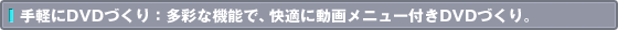 MPEG2エンコードは、エンコードを行う前に映像全体の動き検出を行い、最適なビットレートを配分する2パスVBR(可変ビットレート)で行います。映像の長さに合わせてディスク容量を使い切ることができるので、短時間の映像を高ビットレートで記録した高画質DVDを作ることも可能です。低ビットレートにおいても画質への影響を抑えながら5時間までの映像をDVD収録できます。また、HTテクノロジー インテル Pentium 4 プロセッサーのハイパー・スレッディング・テクノロジーにも対応し、エンコード時間を約30%高速化しました*。