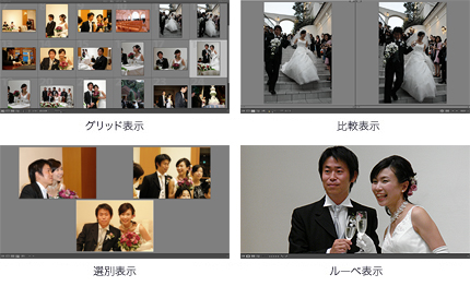 一連の画像サムネイルを表示する「グリッド表示」、比較検討するために、複数の画像を並べて表示する「比較表示」、グループ化した画像の中から1枚を選ぶような場合には「選別表示」、さらに、画像の一部をすばやく拡大表示する「ルーペ表示」など、さまざまな表示オプションを装備。ベストショットをすばやく見つけ出せます。
