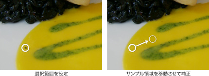 「スポット修正」ツールを使えば、イメージセンサーやレンズなどについたホコリによる汚れ等を、修正することができます。他の領域をサンプル領域として設定する「コピースタンプ」や、サンプル領域のテクスチャと陰影を修復元の色となじませて適用する、「修復」ツールが用意されています。