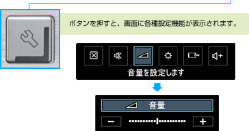 | ワンタッチで画面上に各種設定機能を表示できる、ファンクションセレクターボタン。ミュート、音量調整、輝度調整などの各種設定が可能。操作は画面に表示されたボタンにタッチするだけです。 |