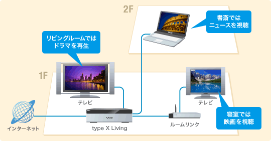 リビングルームにあるtype X Living内のコンテンツを、書斎のVAIOや寝室のテレビ*から呼びだして鑑賞できます。それぞれの部屋で違ったコンテンツの同時再生が可能。リビングルームで録画したドラマを視聴しながら、寝室で映画、書斎でニュースや音楽を再生したりできます。また、録画したデジタル放送のコンテンツを、DTCP-IP規格に従って、コンテンツを保護した状態でホームネットワーク内に配信できます。
